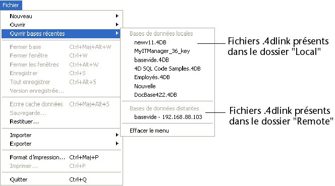 Les fichiers présents dans ces répertoires sont affichés par 4D dans le sous-menu Ouvrir bases récentes> du menu Fichier :