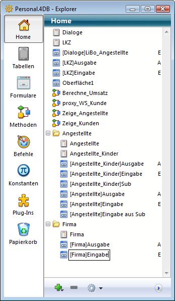 Ähnlich wie die Ordner in Windows und Mac OS Betriebssystemen enthalten 4D Ordner verschiedene Objekte, die nach eigenen Kriterien gruppiert werden, in der Regel nach Funktionalität und nicht nur nach Typ. Sie können z.B. im Ordner Meldungen alle Objekte gruppieren, die zum Meldungssystem in Ihrer Anwendung gehören. Sie können Objekte vom Typ Tabelle, Formular und Projektmethode in Ordner legen. Auch Unterordner auf mehreren Ebenen sind möglich. Alle selbst erstellten Objekte der Struktur, also Tabellen, Formulare und Projektmethoden erscheinen immer auf der Seite Home. Sie werden auch auf den anderen Seiten des Explorer aufgelistet.