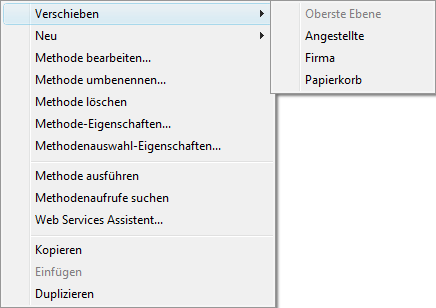 Mit dem Eintrag Verschieben des Kontextmenüs auf der Seite Home können Sie den Inhalt eines Ordners ändern, ohne vorher den Zielordner aufzuklappen. Das Kontextmenü erscheint, wenn Sie mit der rechten Maustaste auf das Objekt, den Ordner oder die Auswahl klicken. Das DropDown-Menü zeigt alle vorhandenen Ordner und Unterordner als mögliche Ziele an: