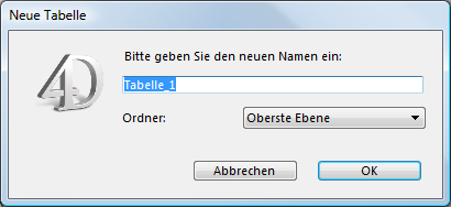 Sie können ein Objekt schon beim Erstellen in einen Ordner legen. Das jeweilige Dialogfenster zum Erstellen von Tabellen, Formularen bzw. Projektmethoden ermöglicht, im DropDown-Menü Ordner den gewünschten Ordner auszuwählen. Objekte werden standardmäßig auf die oberste Ebene oder in den zuletzt im Explorer gewählten Ordner gelegt. Beispiel für das Dialogfenster zum Erstellen einer Tabelle: