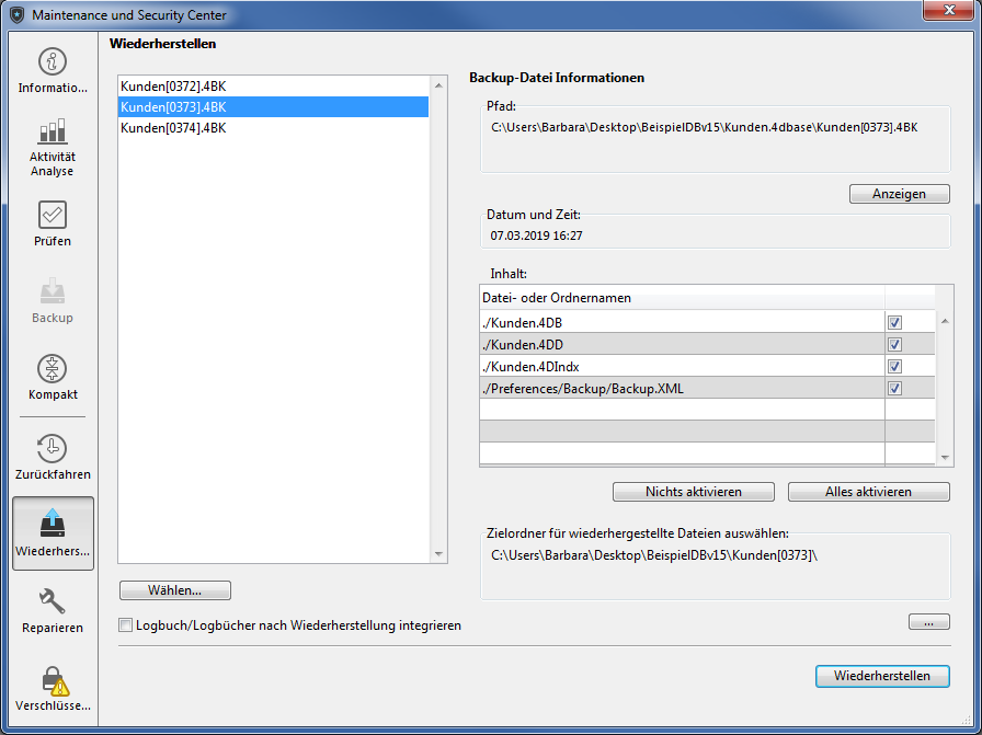 - Inhalt: Inhalt der Backup-Datei. Neben jedem Eintrag in der Liste gibt es ein Ankreuzfeld, über das Sie angeben, ob er wiederhergestellt werden soll. Über die Schaltflächen Nichts aktivieren oder Alles aktivieren stellen Sie die Liste der Einträge zusammen, die Sie wiederherstellen wollen.