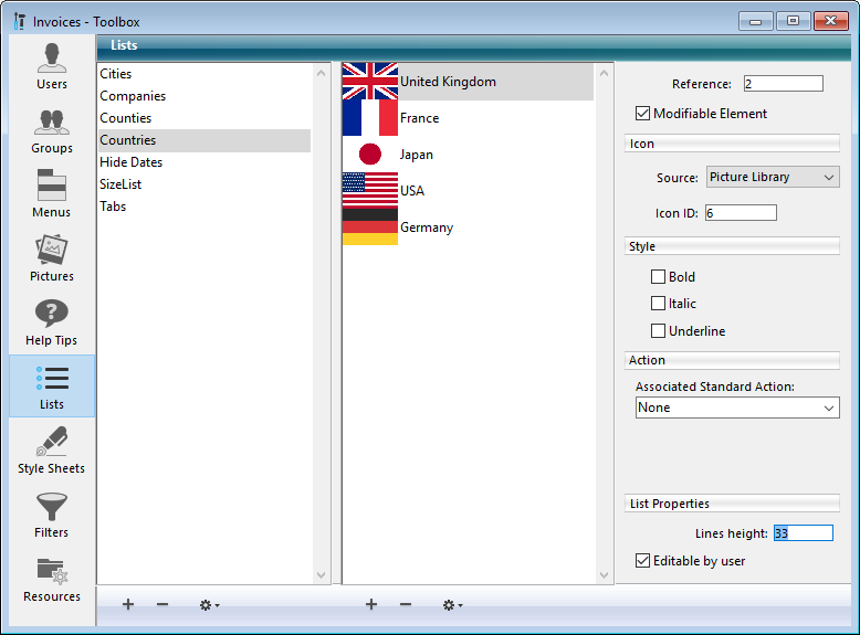To prevent the user from modifying a list, select the list and deselect the Editable by user option.