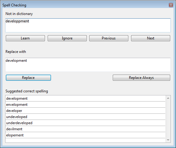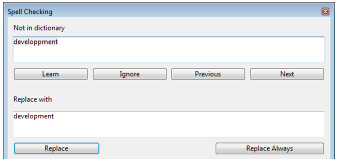 • Learn: The unknown word is added to the dictionary; it will no longer be indicated by the spell checker.