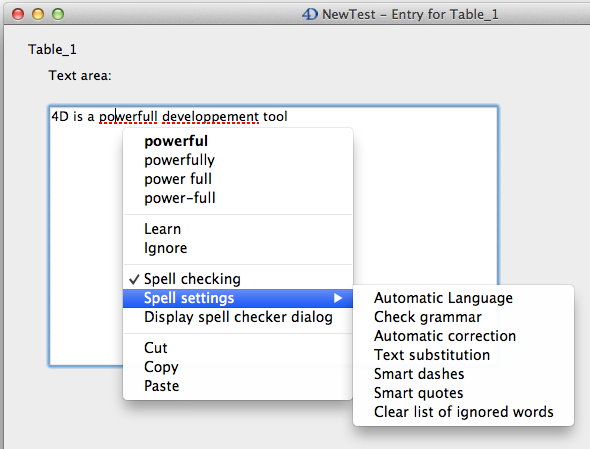 In 4D, spell-checking is applied continuously in text areas, with errors highlighted directly in the text with a dotted underline: