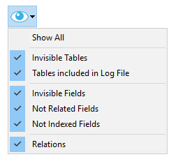 デ フォルトですべてのオブジェクトが表示されます。この機能を使用してさまざまな表現 (もっとも単純なものから完全な表示まで) を得ることができます。そして必要な情報のレベルに基づくストラクチャーの検証ツールを提供します。選択はすべてのテーブルとフィールドに適用されます。 設定はユーザーごとに異なり、ウィンドウを閉じる際に保存されます。特定のオブジェクトを非表示にしてもテーブルの位置は変わりません。