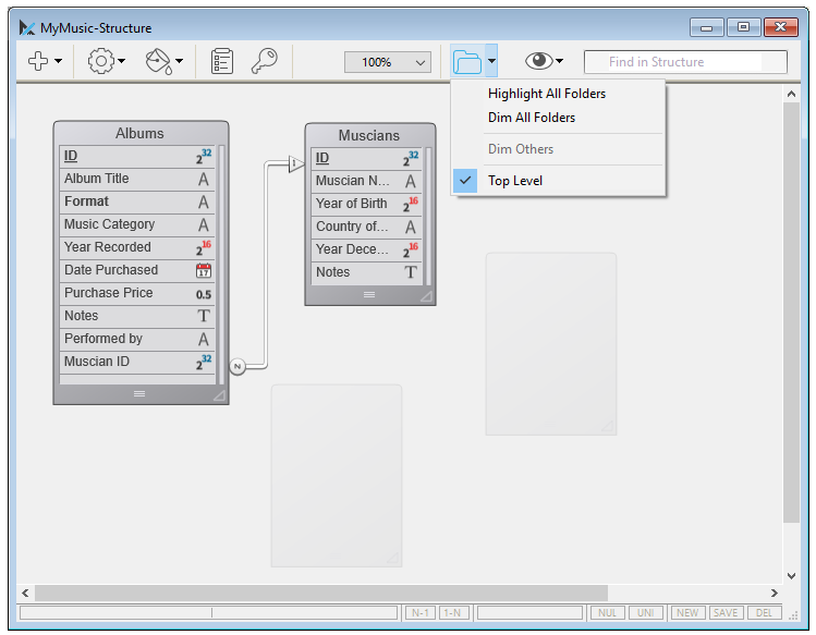 エクスプローラーウィンドウのホームページページで定義されたフォルダーに基づき、ストラクチャーエディター内でテーブルグループを非表示にすることができます。ストラクチャーエディターのツールバーにあるフォルダーボタンを使用してテーブルの表示を設定します。