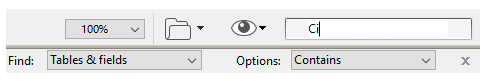 検索は値を入力するに従いリアルタイムで実行されます。検索されたテーブルやフィールドは強調表示されます。何も見つからないと、検索条件エリアが赤に変わります。検索モードを抜けるには、オプションバー (Windows) または検索条件エリア (Mac OS) のボタンをクリックするか、エリア内の文字をすべて削除します。