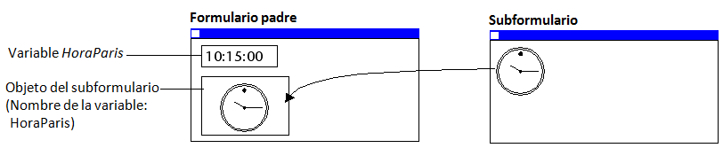 La variable asociada al subformulario permite vincular los dos contextos (formulario y subformulario) para dar los toques finales a interfaces sofisticadas. Por ejemplo, imagine un subformulario que representa un reloj dinámico, insertado en un formulario padre que contiene una variable editable de tipo hora: