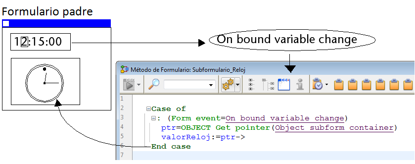 Nota: si mueve "manualmente" las manecillas del reloj, esto también genera el evento formulario On Data Change en el método del objeto de la variable valorReloj en el subformulario.