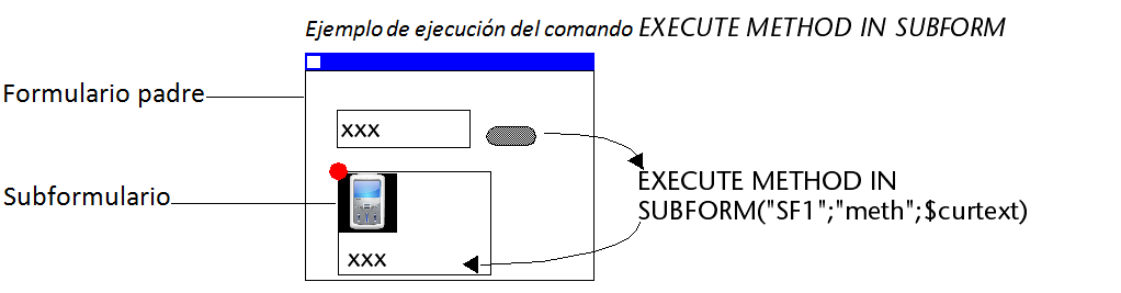 El comando EXECUTE METHOD IN SUBFORM permite a un formulario o a uno de sus objetos solicitar la ejecución de un método en el contexto de la instancia del subformulario, lo que le da acceso a las variables, objetos, etc. del subformulario. Este método también puede recibir parámetros.
