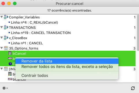• A substituição é realizada em todos os elementos presentes na lista e não em uma seleção. Entretanto, é possível reduzir a operação de substituição, reduzindo o conteúdo da lista utilizando o comando Remover do menu contextual (usando o botão direito do mouse):