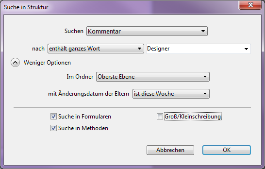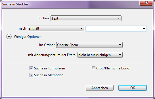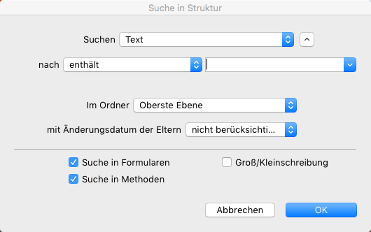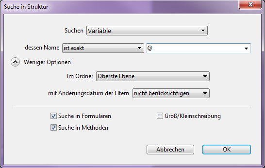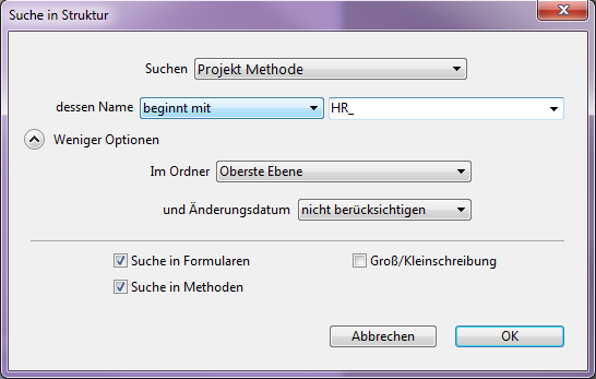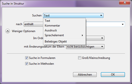 • Suche in Methoden: Ist diese Option nicht markiert, läuft die Suche in der Datenbank mit Ausnahme von Methoden und Methodennamen.