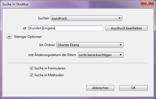 • Suche in Formularen: Ist diese Option nicht markiert, läuft die Suche in der Datenbank mit Ausnahme von Formularen und Formularnamen.