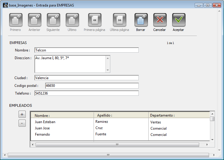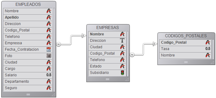 Una tabla es una tabla Uno o Muchos dependiendo de la relación con la otra tabla. La tabla [EMPRESAS] es la tabla Muchos en la relación con la tabla [CODIGOS_POSTALES] y es la tabla Uno en la relación con la tabla [EMPLEADOS].