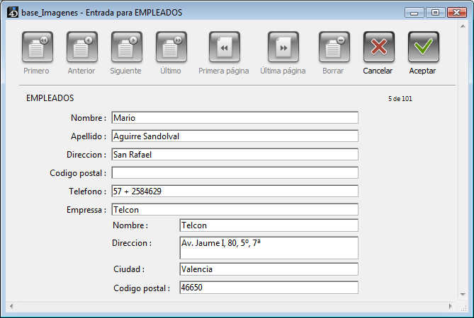 Cuando un registro de la tabla [EMPLEADOS] se convierte en el registro actual, 4D carga el registro correspondiente de la tabla [EMPRESAS]. Si algunos campos han sido incluidos desde la tabla [EMPRESAS], los valores de estos campos se muestran automáticamente. La siguiente imagen muestra cómo el nombre de la empresa en un registro de la tabla [EMPLEADOS] especifica un registro de la tabla [EMPRESAS] de manera que el registro de la tabla [EMPLEADOS] puede mostrar la dirección y número telefónico de la empresa: