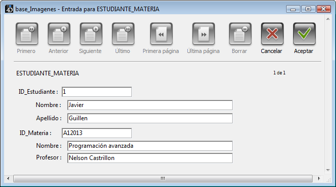 Un registro similar existe por cada materia en la que el estudiante se haya inscrito. En la tabla [ESTUDIANTE_MATERIA] sólo están almacenados actualmente los campos de identificación del estudiante y el nombre de la materia. Cada registro indica la inscripción de un estudiante en particular a una materia específica.