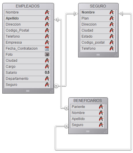 Cuando un usuario está trabajando con un registro de la tabla [EMPLEADOS], el registro relacionado de la tabla [SEGURO] se carga y se convierte en el registro actual para esa tabla. Sin embargo, también hay una relación entre la subtabla [BENEFICIARIOS] y la tabla [SEGURO]. Esto significa que otro registro relacionado se carga en la tabla [SEGURO] de acuerdo al subregistro actual de la tabla [BENEFICIARIOS] (el primer registro de la selección actual). Si la empresa aseguradora de los beneficiarios es diferente a la de su padres, esta estructura relacional causará problemas. En este caso, 4D no detiene la ejecución de las relaciones. Ambas relaciones se ejecutan, pero no al mismo tiempo. Si quiere utilizar una estructura de este tipo, debe utilizar relaciones manuales y controlar las relaciones utilizando los comandos descritos en el Manual del lenguaje de 4D.