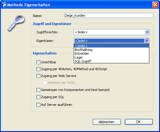 Das folgende Beispiel zeigt „Eigentümer“ Zugriffsrechte für die Projektmethode Zeige_Kunden die einer Gruppe zugewiesen wurde. Sie können Gruppen generell Rechte auf der Ebene Zugriff (Benutzung) und/oder „Eigentümer“ (Ändern) zuweisen.