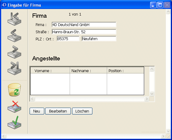 Sie können in einem Unterformular eigene Schaltflächen zum Steuern der Dateneingabe hinzufügen. Jeder Schaltflächentyp (invertierte, unsichtbare Schaltfläche, etc.) ist verwendbar. Sie können die Aktion dieser Schaltflächen über Programmierung (siehe Handbuch 4D Programmiersprache, Kapitel Eingabe) oder über Standardaktionen definieren.