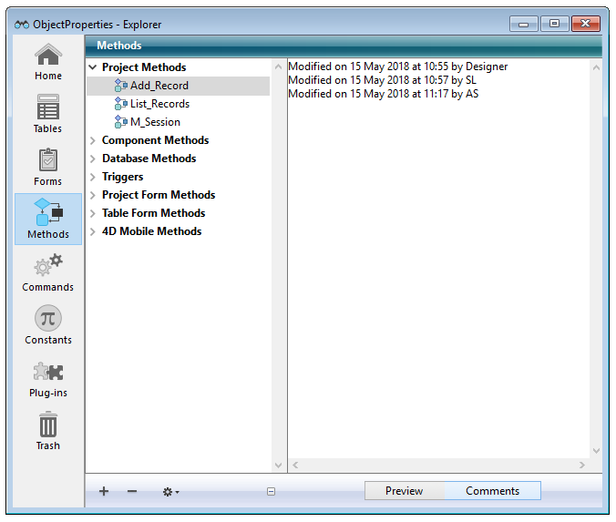 Moreover, 4D allows you to generate automatic comments, which means that 4D automatically enters comments when an object is created or modified.