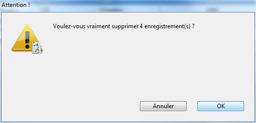 Lorsque l’utilisateur clique sur le bouton ou choisit la ligne de menu, une boîte de dialogue de confirmation apparaît, lui permettant de confirmer ou d’annuler la suppression :