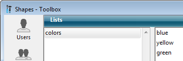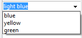 Usted desea mostrar un combo box based on a "colors" basado en una lista "colors", definida en la caja de herramientas (que contiene los valores "blue", "yellow" y "green") y mostrar "green" por defecto: