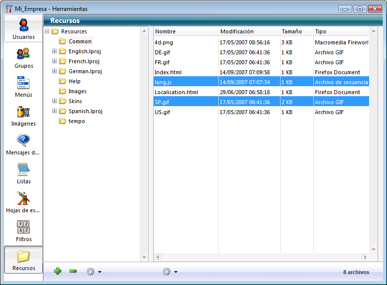 El explorador de recursos permite visualizar y modificar el contenido de la carpeta Resources de la base actual. Cuenta con varios controles para la adición, eliminación, búsqueda y visualización de los elementos de recursos.