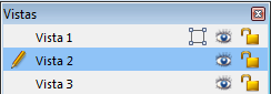 Hay 9 vistas disponibles por formulario, llamadas por defecto Vista 1 a Vista 9 (los nombres pueden cambiarse). Cada vista se puede ocultar mostrar o bloquear. La gestión de vistas se realiza desde la paleta Vistas: