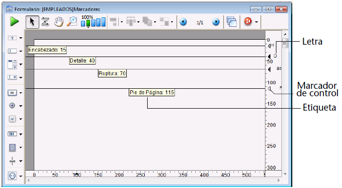 Si no quiere imprimir detalles, arrastre el marcador de detalle sobre el marcador de encabezado. Si no necesita un encabezado, arrastre el marcador de encabezado a la parte superior del formulario (punto 0).