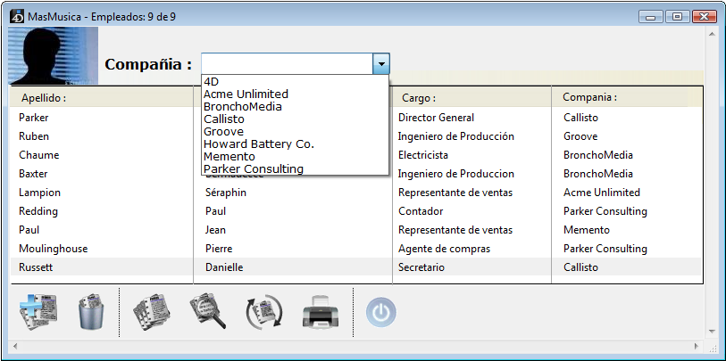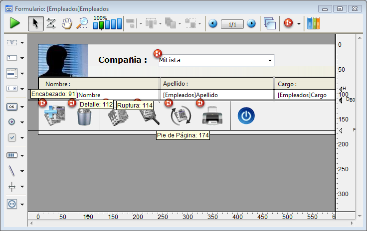 Os botões de controle foram localizados na área de pé de página e uma imagem personalizada foi localizada na área de cabeçalho. A área de cabeçalho também inclui uma lista suspensa que lhe permite selecionar a empresa cujos empregados você deseja visualizar,