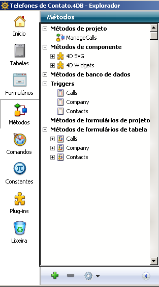 Os botões à esquerda do Explorador permitem aceder às diferentes páginas de objetos do ambiente Desenho. O Explorador tem páginas independentes para as tabelas, formulários, métodos, comandos, constantes e plug-ins.