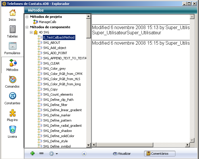 4D permite associar comentários às pastas, tabelas, campos, formulários e métodos (banco, projeto, triggers e formulário) de seu banco de dados. A visualização e modificação dos comentários é realizada utilizando o Explorador (a área de vista prévia deve estar expandida).