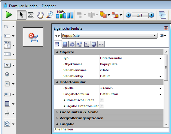 Hinweis: Date Picker, Pop-Up Datum und Datums-Eingabebereiche nutzen zu Beginn alle dieselbe Datumsvariable und zeigen bei Verwenden im gleichen Formular das jeweils zutreffende Datum.