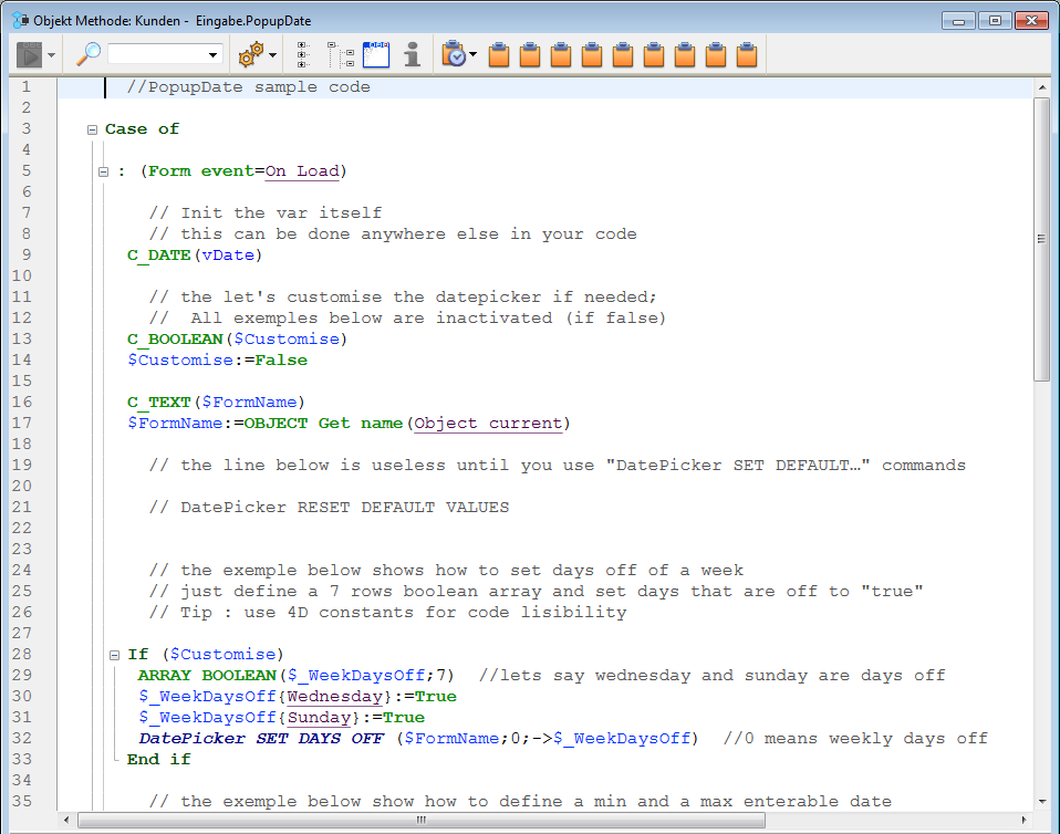 Sie können den Beispielcode in der Objektmethode über die Befehle für das Widget Date Picker verändern.