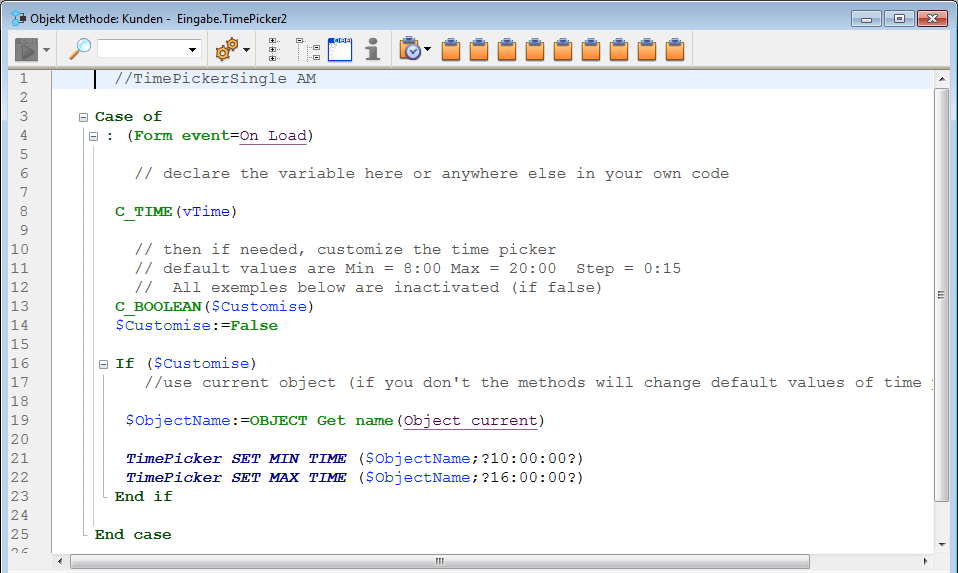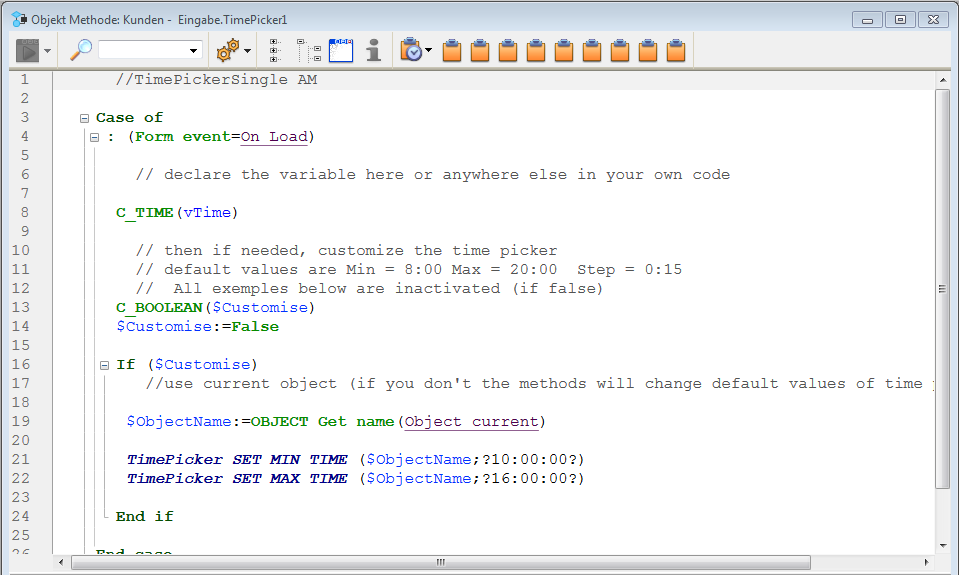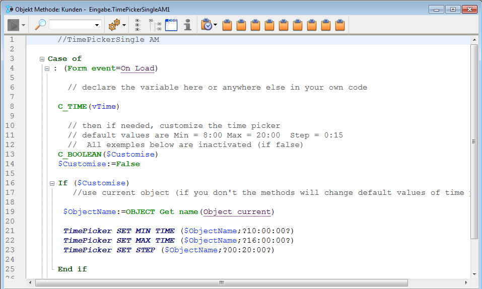 Die Objektmethode enthält Beispielcode, den Sie über die Befehle für das Widget Time Picker verändern können.