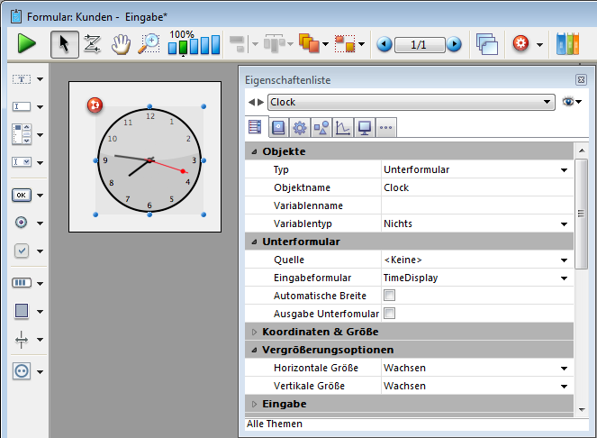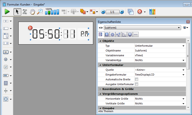 Fügt einen Zeitanzeigebereich (Uhr oder LCD) als statische Zeitanzeige oder laufende Uhr hinzu, je nach Art der zugewiesenen Variablen oder des Ausdrucks.