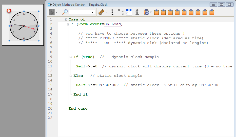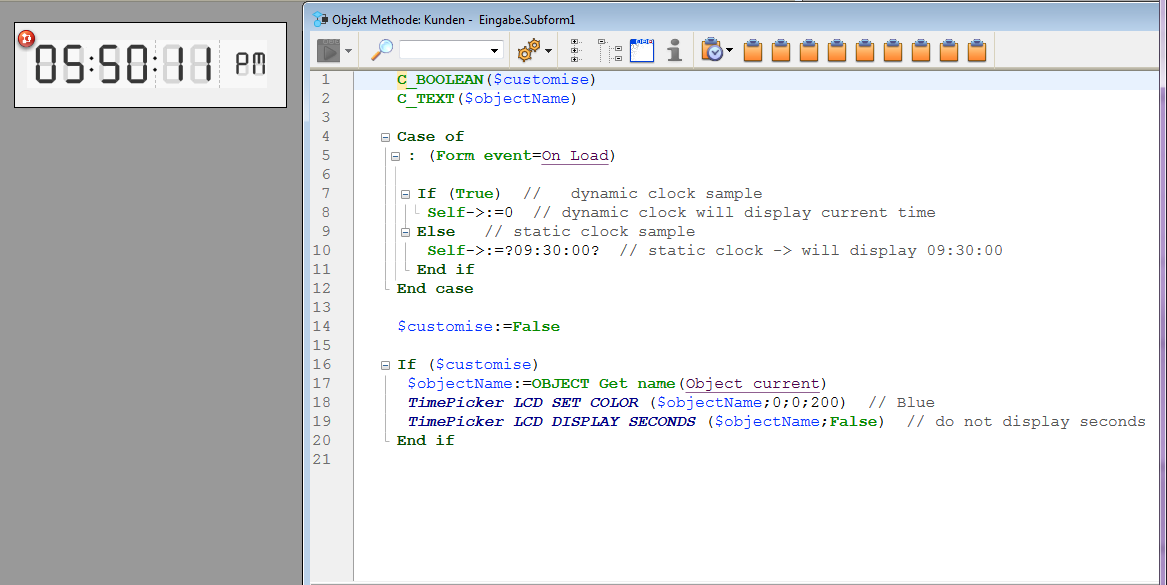 für einen Ausdruck: Weisen Sie dem Ausdruck einen Longint- oder Time zu. Wenn Sie ihn auf 0 setzen (z.B.: Form.myTime:=0 oder Form.myTime:=?00:00:00?), zeigt die Uhr oder das LCD die aktuelle Zeit an.