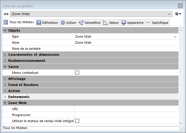 Lorsque vous sélectionnez un objet Zone Web dans l’éditeur de formulaires, la liste des propriétés affiche des propriétés spécifiques :