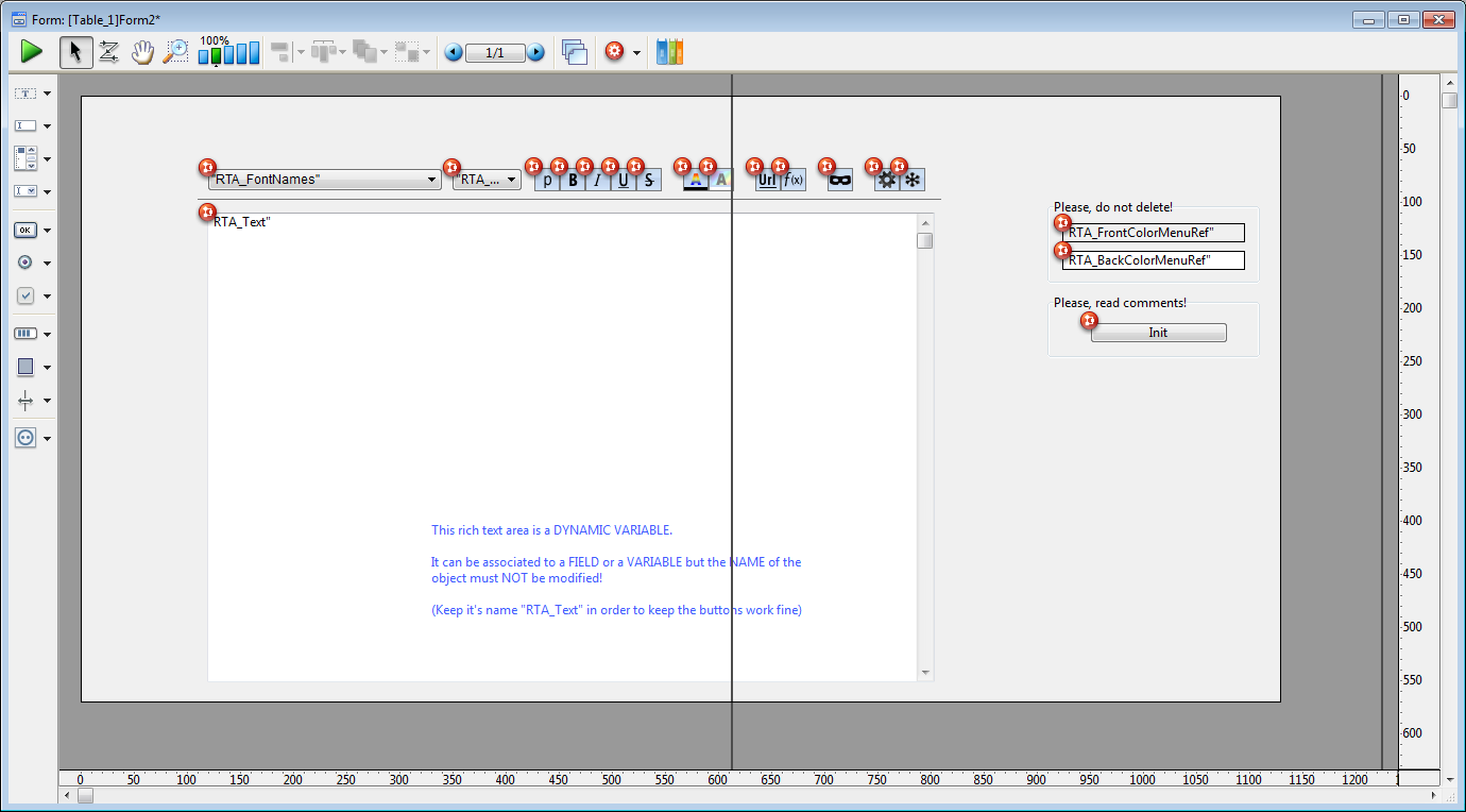 Cette zone de texte riche consiste en une variable dynamique nommée “RTA_Text”. Pour que les menus et les boutons de cette zone fonctionnent correctement, il est important de ne pas modifier ce nom.