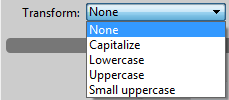 Le menu Align. vert. permet de modifier le texte en indice ou en exposant et le menu Transform. permet de choisir parmi différentes combinaisons de casse :
