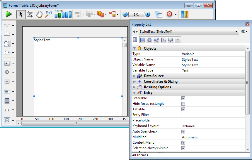 Ajoute une zone de texte stylé permettant de définir les tailles, les polices et les couleurs des caractères. Par défaut la zone est redimensionnable, possède un ascenseur vertical ainsi qu'un menu contextuel. Vous pouvez modifier ces options par défaut en utilisant la Liste des propriétés.