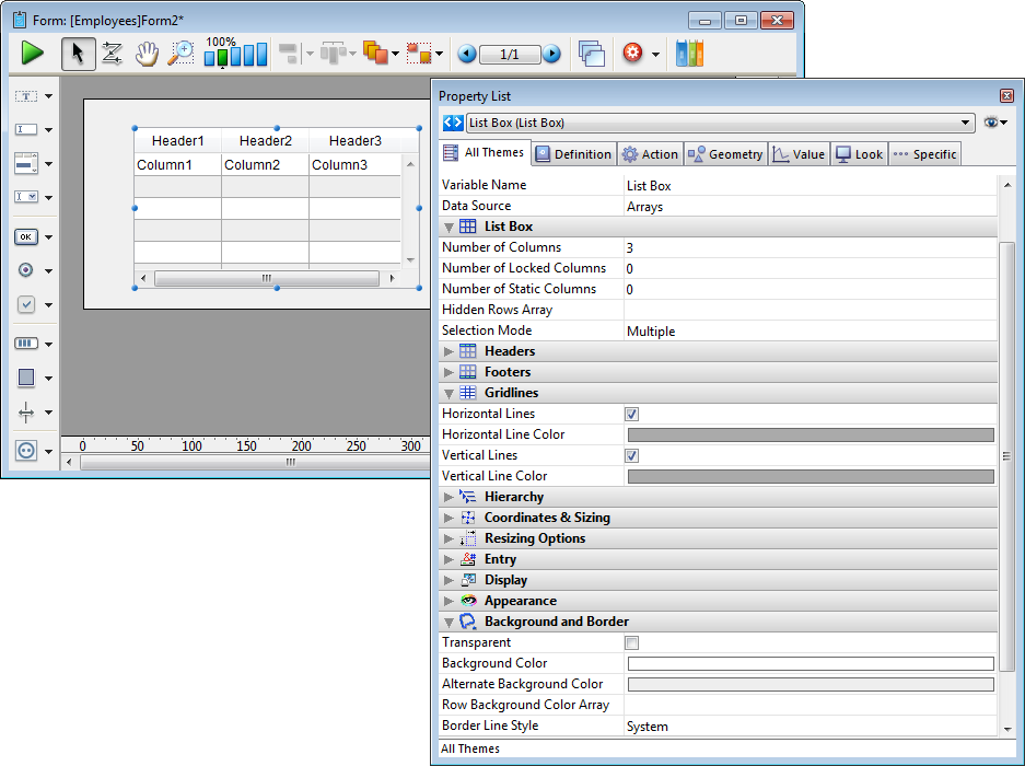 Ajoute un objet list box à trois colonnes que vous pouvez utiliser pour afficher des tableaux groupés et synchronisés. Ils peuvent être saisissables, triables, déplaçables selon les options définies dans la liste des propriétés. Vous pouvez utiliser la Liste des propriétés pour spécifier la source de données et modifier les options.