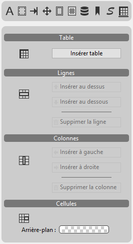 Ce panneau gère les tables de la zone 4D Write Pro. Vous pouvez insérer une table, ajouter et supprimer des lignes et des colonnes, et définir les propriétés de la table, des lignes, colonnes ou de cellules individuelles.