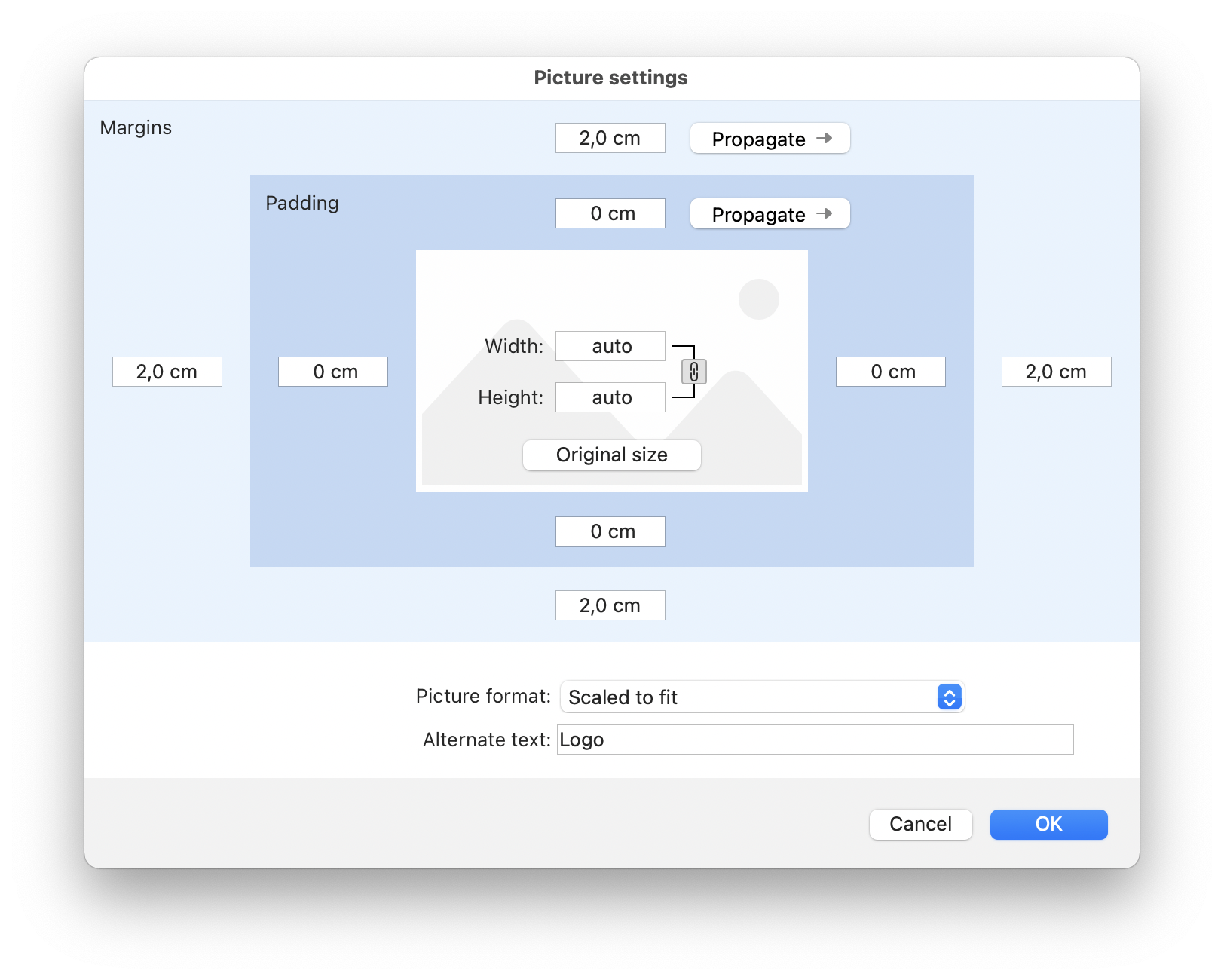 Cliquez sur Paramètres avancés... (images uniquement) pour ouvrir une boîte de dialogue dans laquelle vous pouvez définir la taille et les options avancées de l'image sélectionnée.