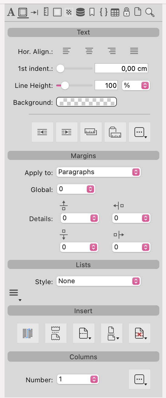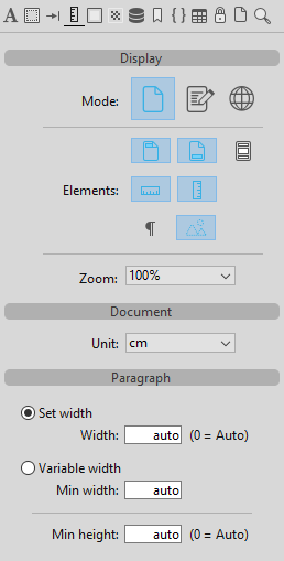 En plus des paramètres appliqués à la totalité du document, l'alignement du texte et les marges peuvent être définis individuellement pour chaque paragraphe et/ou image. Utilisez les icônes situées en haut du panneau afin de configurer les paramètres séparément pour chaque type d'élément (