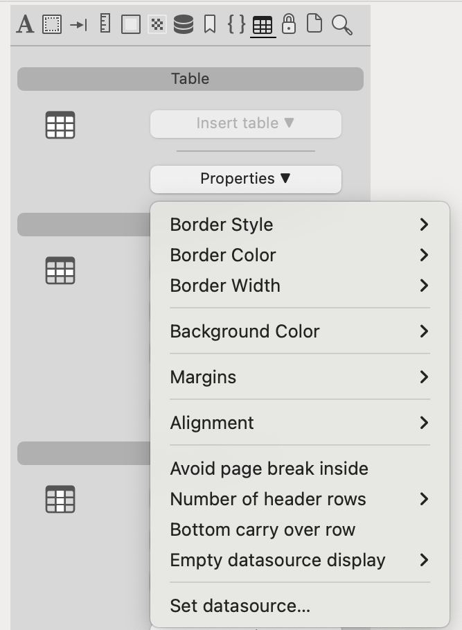 Dans Insérer table, vous pouvez choisir l'un des modèles de table proposés et le modifier à l'aide du menu des propriétés, ou choisir la table Wizard qui apparaît à la fin de la liste pour simplifier davantage le processus de création de la table. Voir la documentation du Table Wizard pour plus de détails.