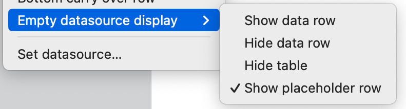 Dans le menu Affichage source de données vide, vous pouvez choisir d'afficher la ligne de données, de masquer la ligne de données, de masquer la table ou d'afficher la ligne de remplacement.